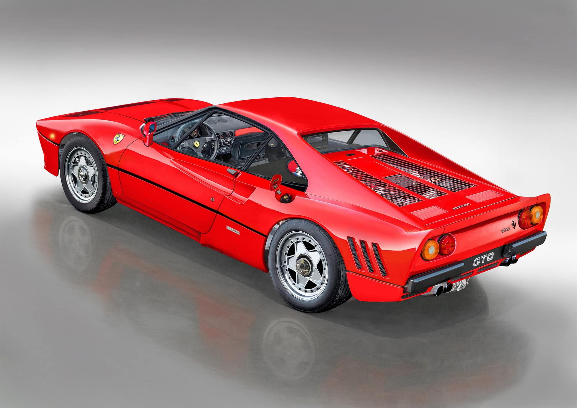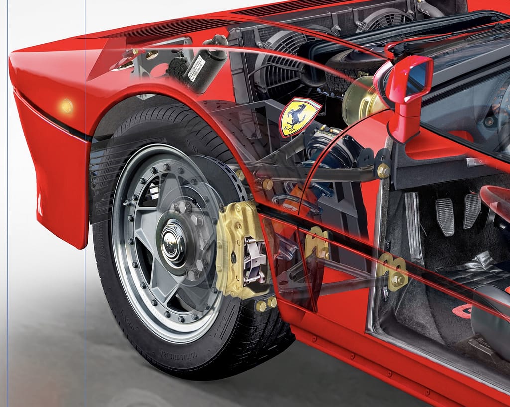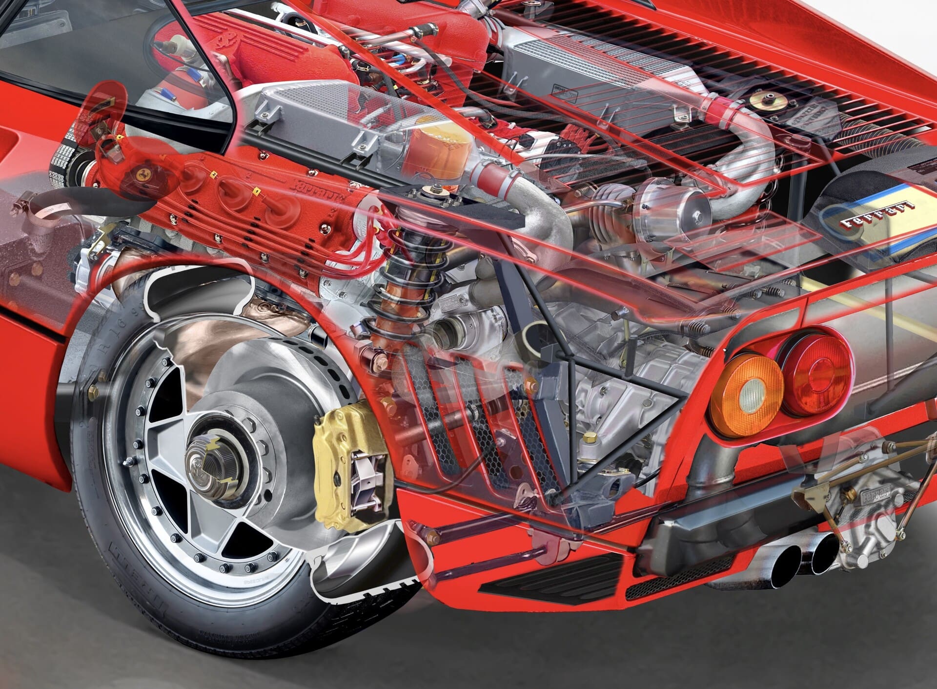 This photorealistic Ferrari 288 GTO cutaway illustration reveals the twin-turbocharged V8 engine and lightweight tubular chassis of Ferrari’s first super sports car.
