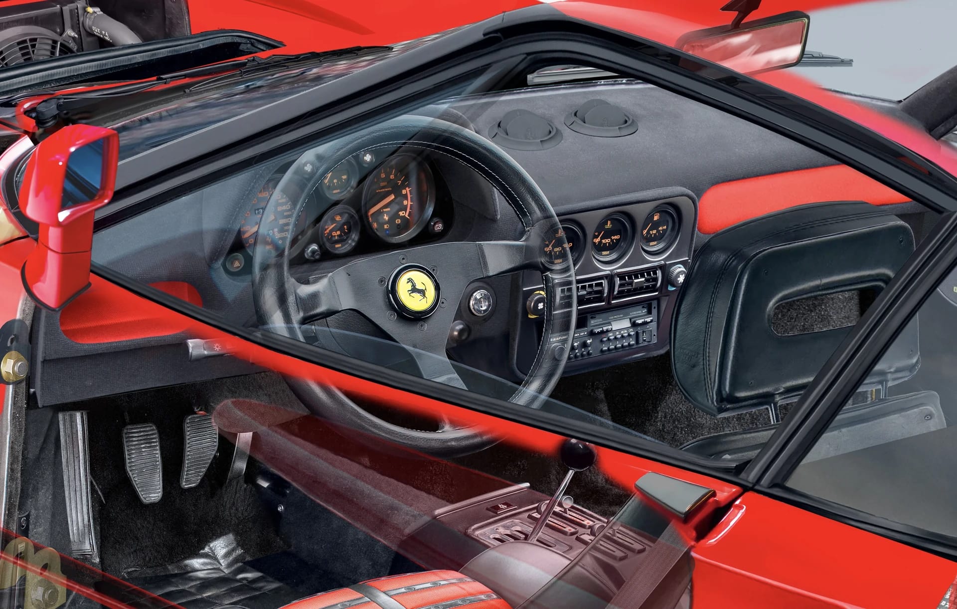 • Cockpit and gearshift in classic Ferrari style, optionally available with air conditioning, radio, and electric windows.