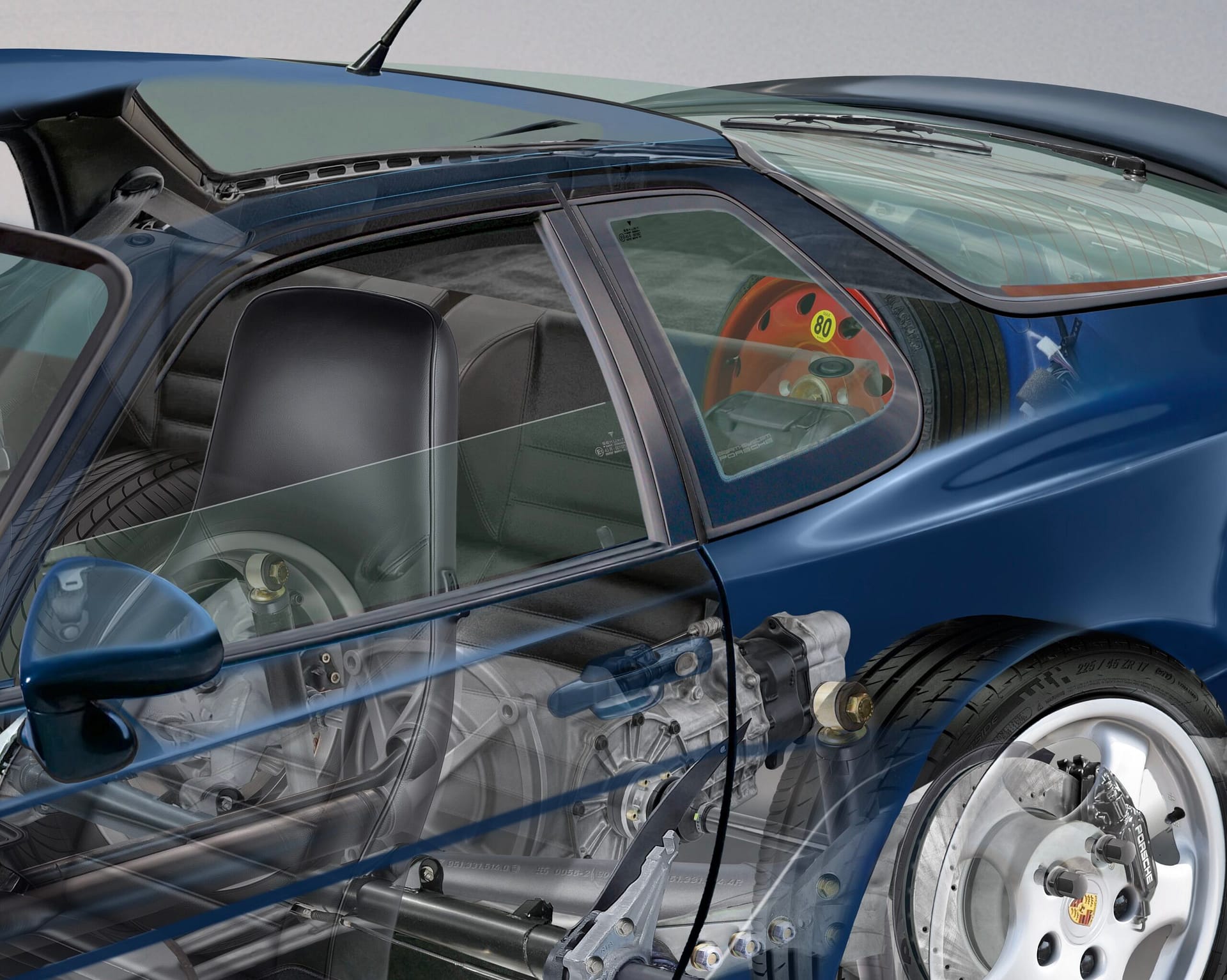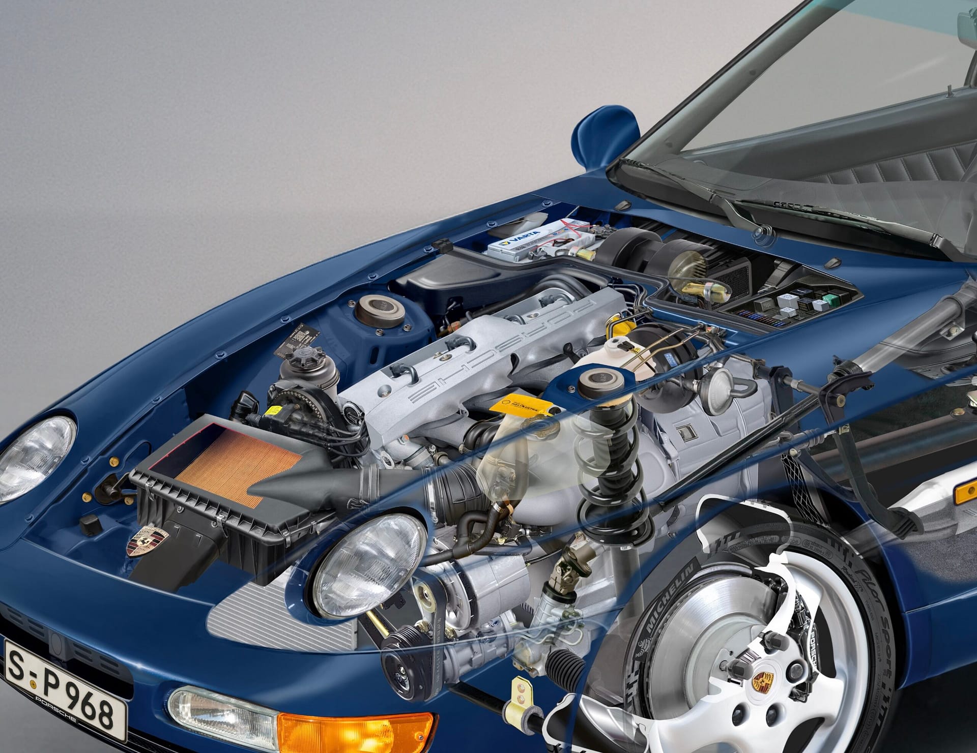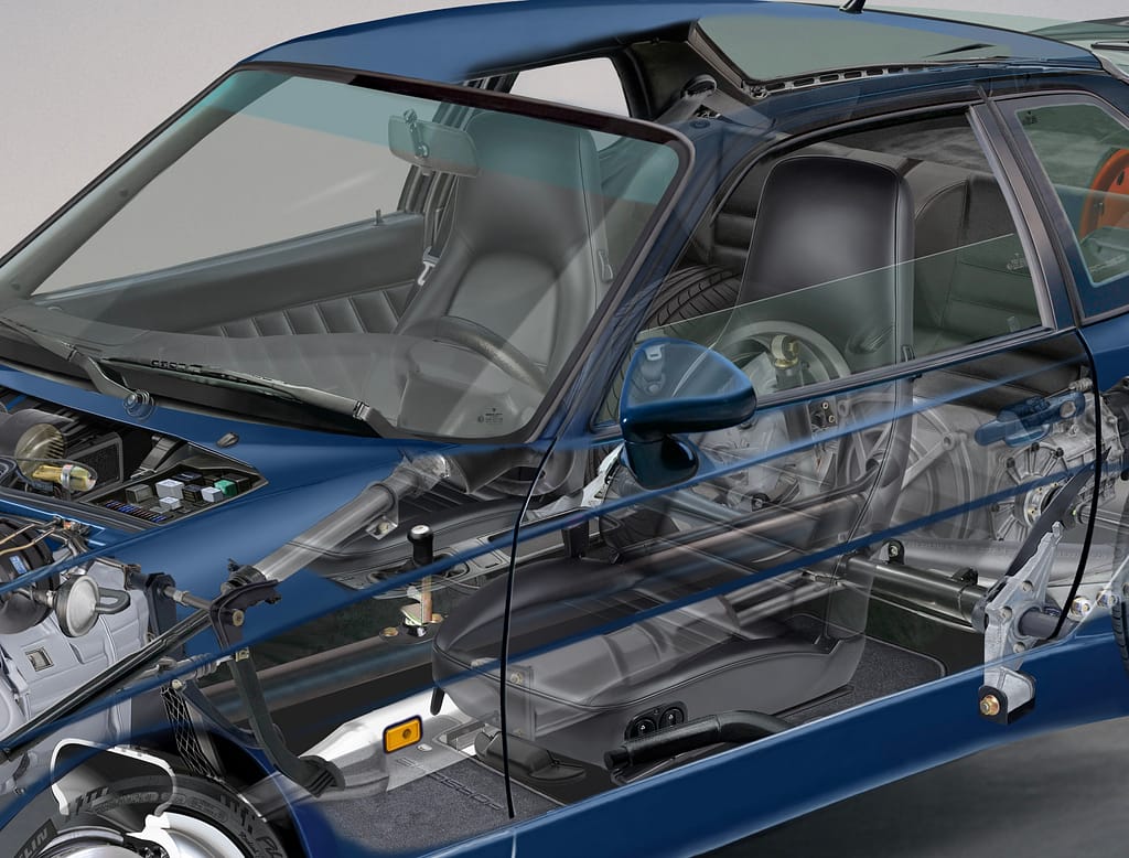 The Porsche 968 is based on Porsche’s transaxle architecture, with the engine mounted at the front and the transmission positioned at the rear.